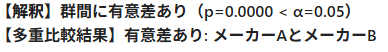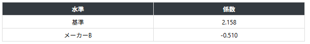 メーカーAを基準として、メーカーBがそれより -0.510 だけ平均が小さいことがわかります。