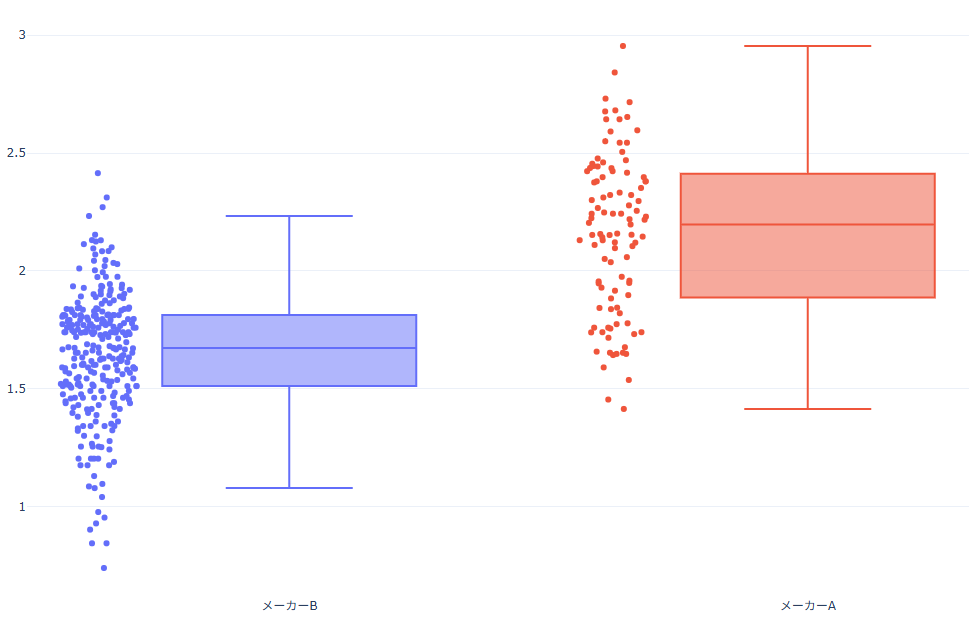 メーカーAとメーカーBの分布の違いを箱ひげ図で確認できます。