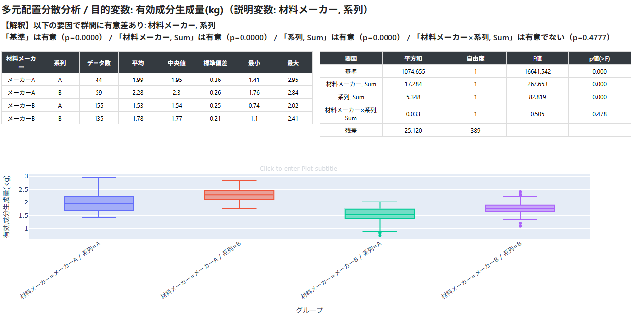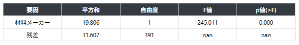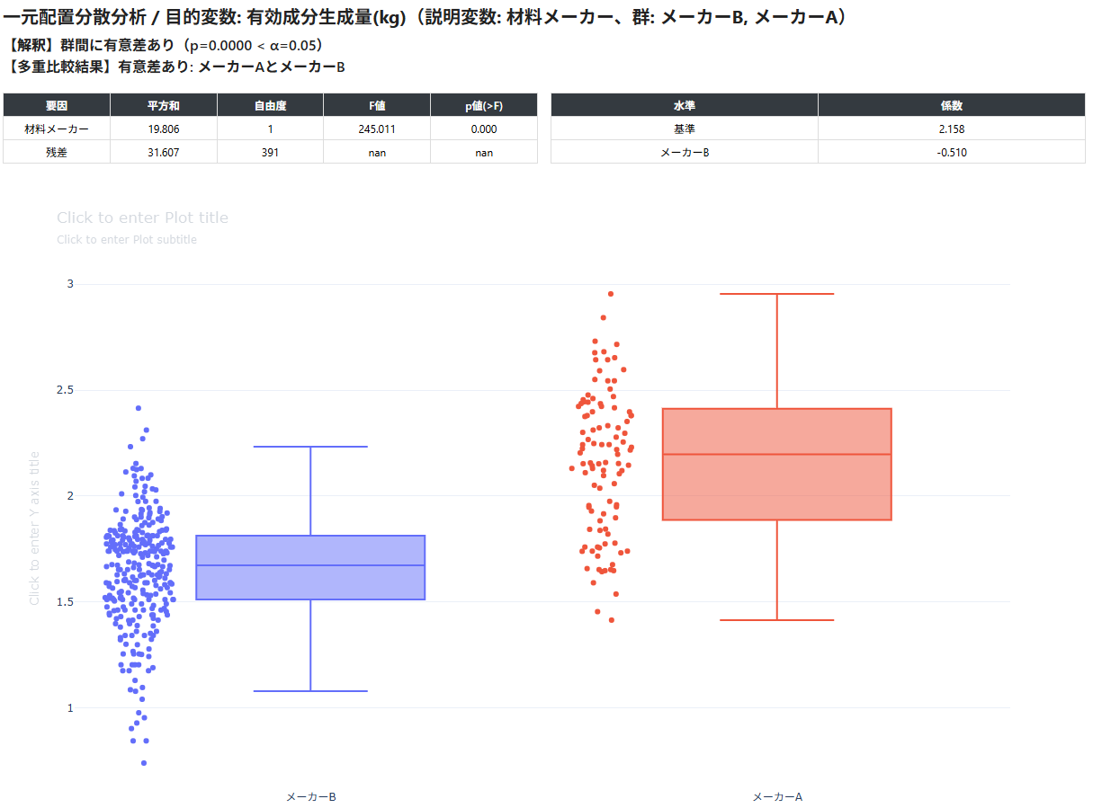 例として、目的変数が「有効成分生成量(kg)」、説明変数が「材料メーカー」の場合、 材料メーカーの p 値が α=0.05 を下回り、群間に有意差があると解釈します。