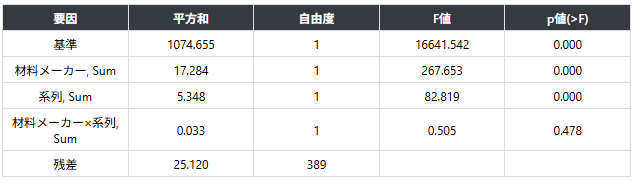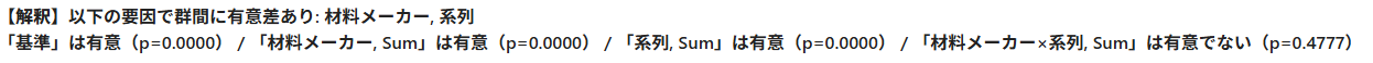 各要因の有意・非有意が表示されます。 例えば「材料メーカーと系列は有意(p=0.000)」「材料メーカー×系列の交互作用は有意でない(p=0.478)」といった内容が示されます。 交互作用が有意でない場合は、要因どうしが影響し合わず、組み合わせても差の大小が入れ替わらないと考えます。