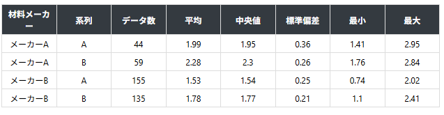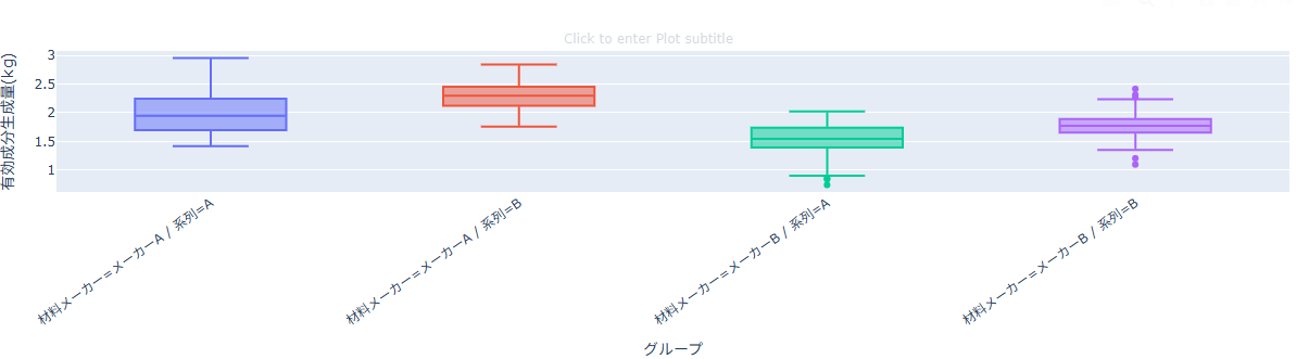 群ごとの傾向や分布の違いを数値で確認できます。 有効成分生成量(kg)はメーカーAのほうがメーカーBより大きく、系列Aは系列Bより小さいことがわかります。
