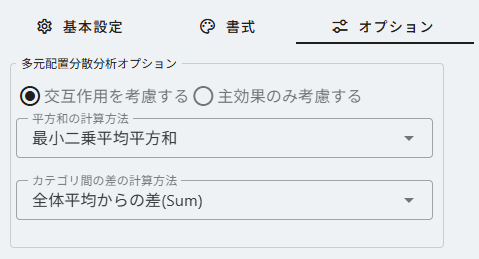 平方和の計算方法は、「どの要因の影響として計算するか」の数え方を選ぶ設定です。