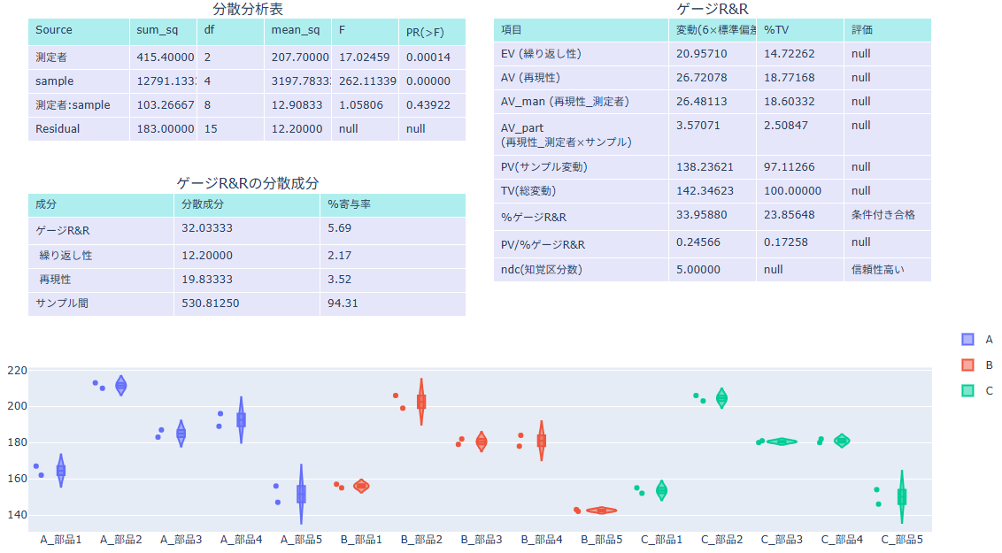 測定データからゲージR&Rを計算し、分散分析表・分散成分表・評価テーブル・分布プロットを表示できます。