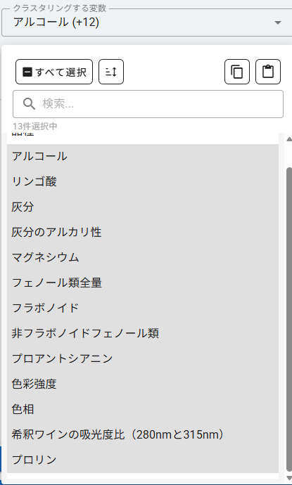 クラスタリングする変数 を選択します。数値列から複数選択できます。