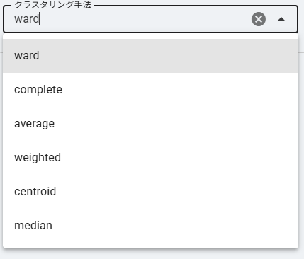 - weighted:各クラスタを同じ重みとして平均距離を計算します。クラスタサイズの偏りが大きい場合に大クラスタへの偏りを抑えます。