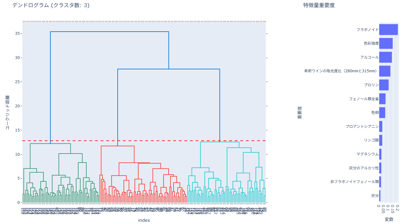 デンドログラムと特徴量重要度が表示されます。