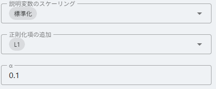 オプション設定(重回帰モード時)- 説明変数のスケーリング: しない / 標準化 / 正規化