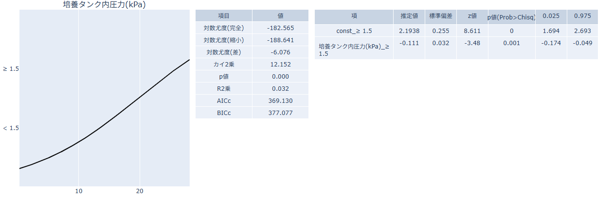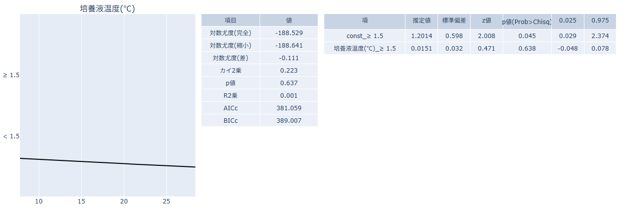 - モデル適合サマリー(中): 対数尤度、カイ2乗、p値、擬似R2、AIC/BIC など、モデル全体の当てはまりを確認します。