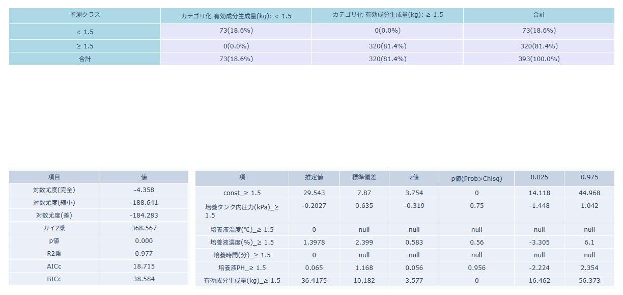 - 係数推定テーブル(右): 各説明変数の係数と有意性を確認し、クラス判別への寄与を読み取ります。
