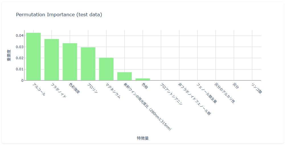 - Permutation Importance :モデルの予測精度にどの説明変数が貢献しているかを示す指標。基本的に正の値を取り、値が大きいほど影響が大きい。