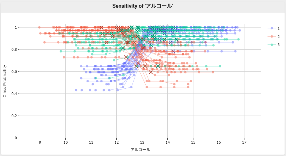 説明変数の値を変化させたときに、各クラスに分類される確率がどう変化するかを確認できます。
