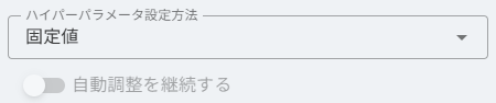 ハイパーパラメータは 固定 または 自動調整 から選択できます。自動調整では1回の実行につき10回の試行を行います。前回のチューニング結果が存在する場合、そこから継続することも可能です。