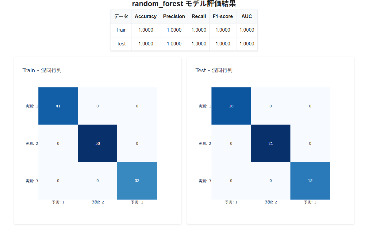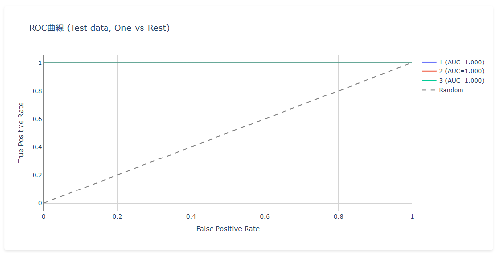 - AUC:ROC曲線下の面積。1に近いほど精度が高い。多クラス分類の場合はOne vs Rest方式でクラスごとに算出されます。