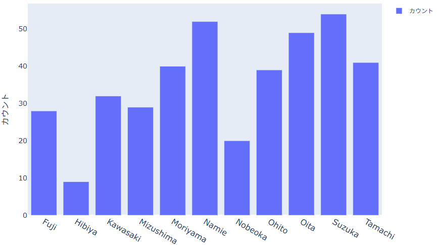 テーブルに含まれる1つ以上のカテゴリ変数や数値変数を選択し、各カテゴリや値ごとの集計結果を棒グラフで可視化します。 カテゴリ変数による層別やカラー変更が可能です。 棒グラフは、カテゴリごとのデータの比較や分布、傾向を視覚的に把握するのに役立ちます。