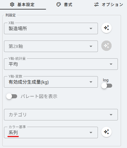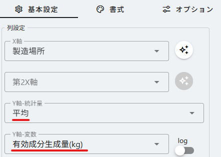 指定した統計量で棒グラフを作成できます。 X軸に指定した各カテゴリの"有効成分生成量"の平均値で棒グラフを描いてみます。