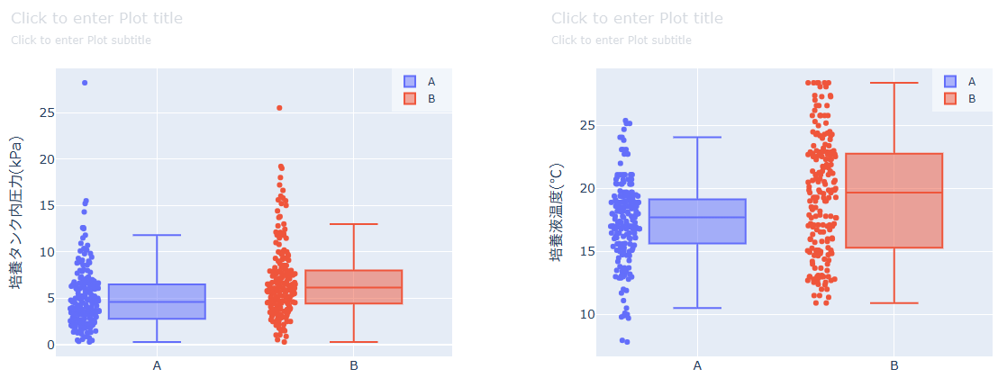 指定したカテゴリカル列の値で層別した箱ひげ図を作成できます。