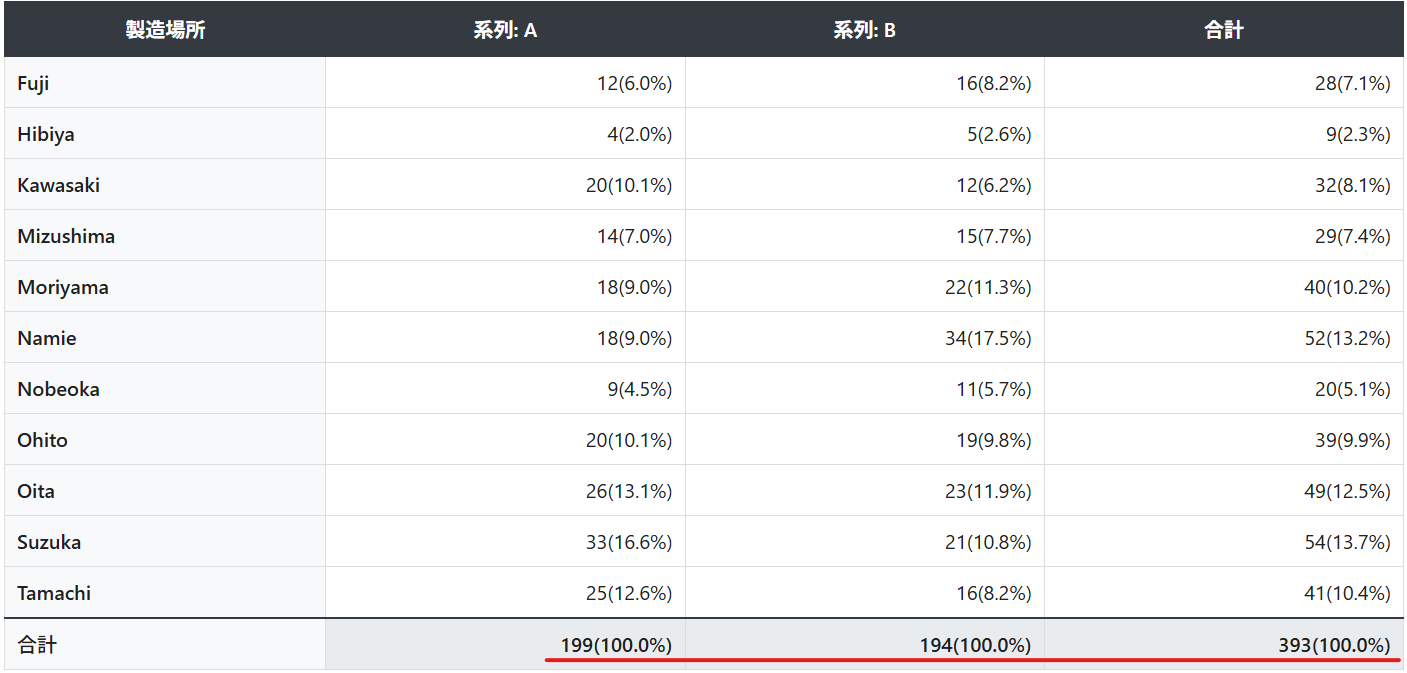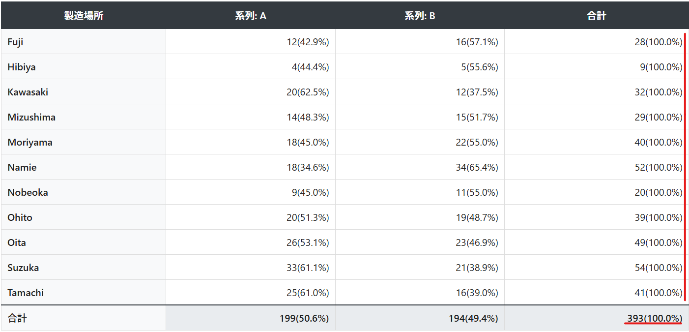 - 行方向:行に指定したカテゴリ別にデータ数の割合が表示されます。