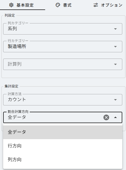 - 列方向:列に指定したカテゴリ別にデータ数の割合が表示されます。